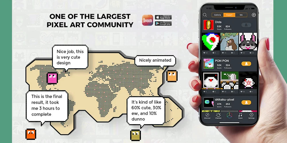 DIVOOM has pixel lovers from all over the world, we all create and share interesting pixel works together in DIVOOM APP. You don't need to worry that you can't create pixel art, here you will get your creative inspiration.